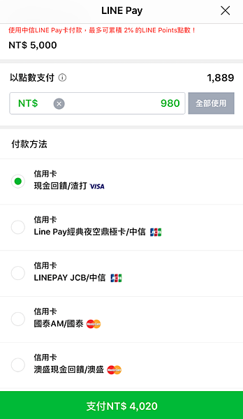 繼續我最一開始的例子,我寰旅里程剩下299里,還差201里就可以把它兌換出去,而201里需要刷4020,因此我只要用980點Line Point,就可以讓我把4020元補滿,不浪費一絲一毫。